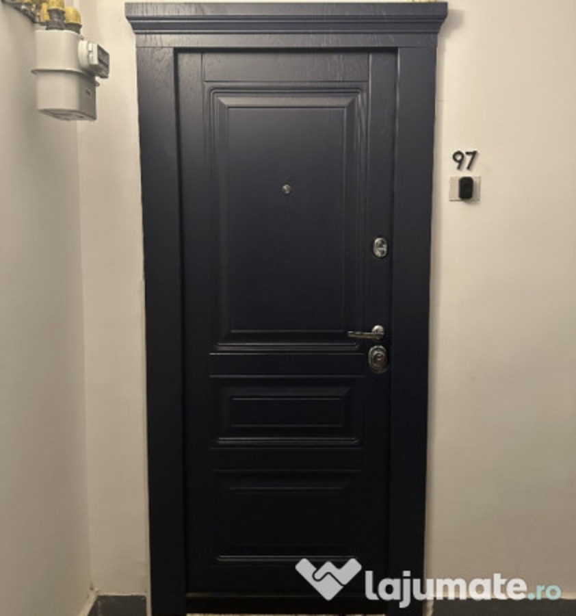 Usa intrare: Metalica cu MDF (model Stejar albastru exterior/Stejar alb interior)