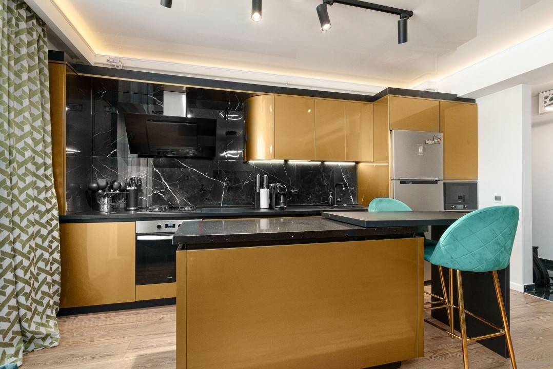 -mobilier de bucatarie Kuziini, dotata cu aparatura electrocasnica de generatie noua de la Teka, in timp ce combina frigorifica este Samsung.