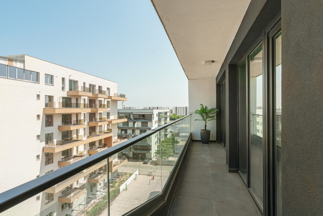 Un apartament de 3 camere, decomandat, cu bucatarie deschisa, doua bai, un hol spatios, prevazut cu un dressing incastrat in perete si o terasa acoperita ce se desfasoara pe toata lungimea apartamentului, cu acces din fiecare camera. O suprafata utila 75 mp si o suprafata totala de 87 mp. Pozitionare nord-vest, vedere libera, distanta rezonabila fata de blocurile din apropiere.