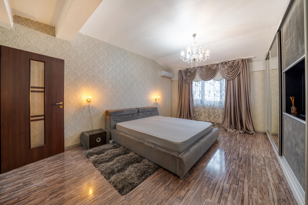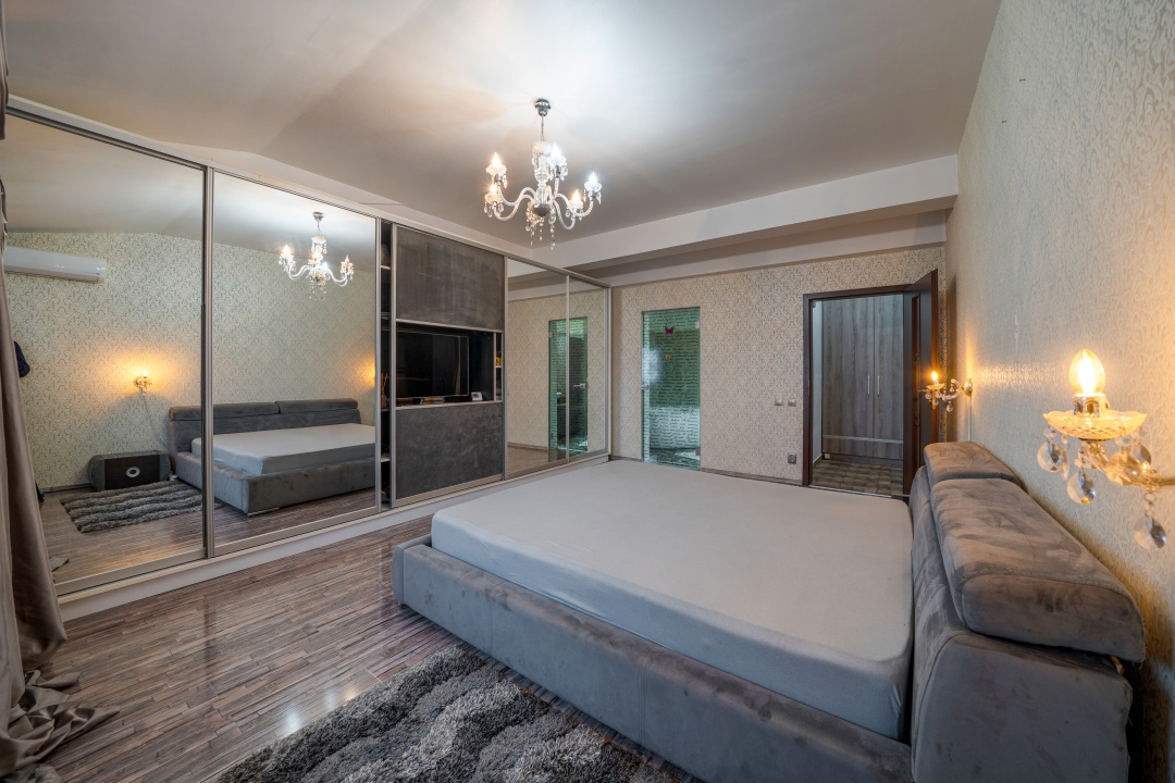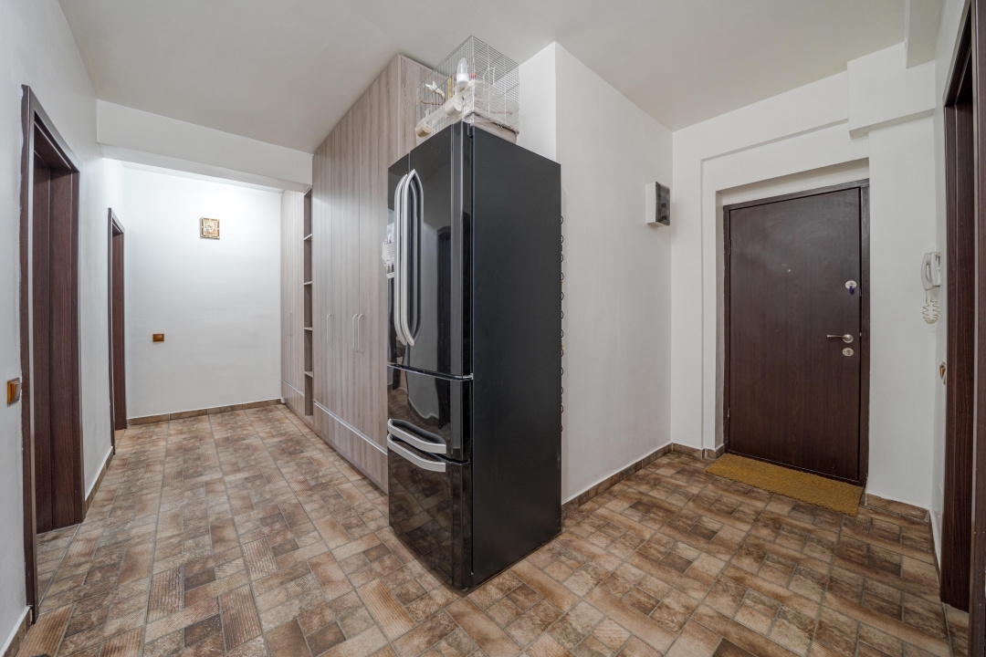 Camerele au suprafete remarcabile, de aproximativ 23 mp, 17 mp si 14 mp, dormitorul matrimonial beneficiind de acces separat catre o baie proprie de aproape 6 mp, un detaliu care aduce un plus de confort si intimitate. Spatiile de depozitare sunt atent gandite, cu dulapuri realizate pe comanda atat pe hol, cat si in cele doua dormitoare, oferind functionalitate fara a incarca vizual locuinta.