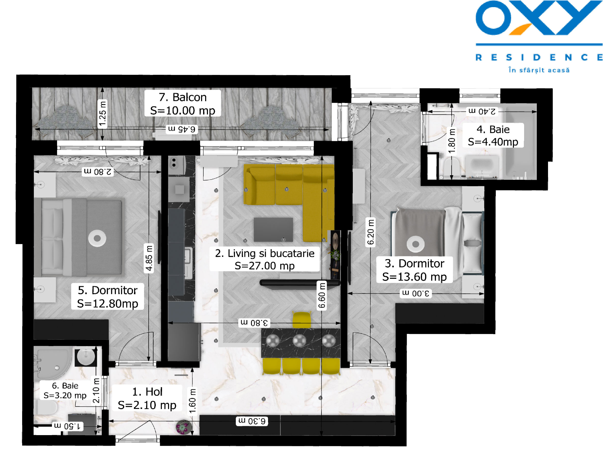 Apartamentul cu 3 camere Tip A, face parte din ansamblul rezidential Oxy Residence 2, situat la 20 de minute de Piata Unirii, in cartierul Bucurestean Rahova, pe Sos. Bucuresti-Magurele nr. 82W (chiar in statia STB Slatina), Sector 5, avand o suprafata total utila de 73.10 mp, fiind compus din hol-2.10 mp, living si bucatarie open space-27.00 mp, dormitor-13.60 mp, baie-4.40 mp, dormitor-12.80 mp, grup sanitar-3.20 mp si balcon-10.00 mp.