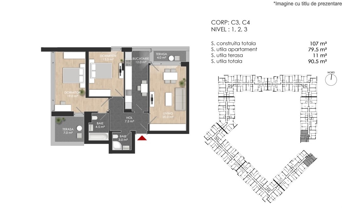 Stoc Limitat din acest model - Apartamentul Nr. 211 - Faza 3 - Model 3Ec: Compus din living (20 mp utili) si bucatarie inchisa (12 mp utili), 2 dormitoare (19, respectiv 13,5 mp utili), 2 bai (cada si cabina dus), 1 hol de acces si spatii de depozitare si 2 balcoane de 7, respectiv 4 mp.