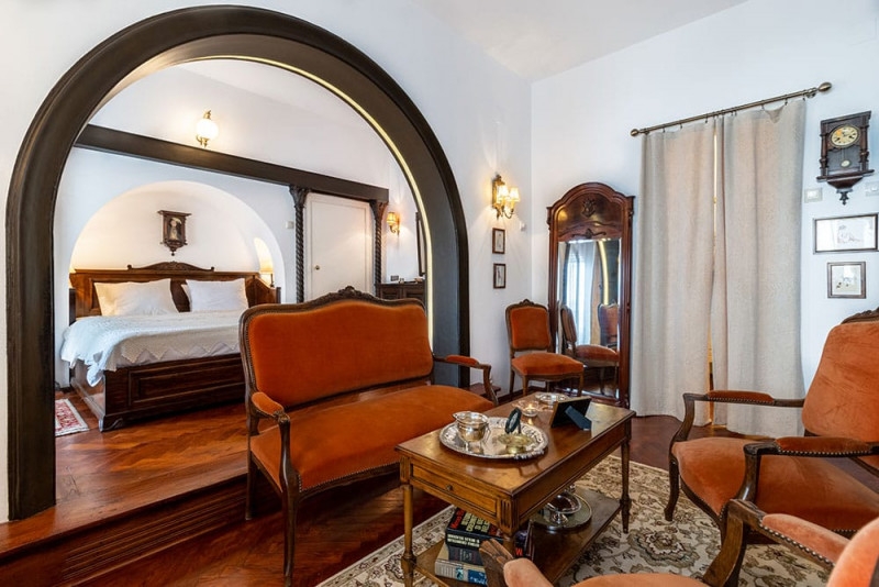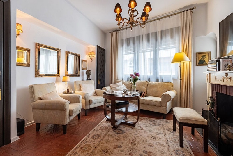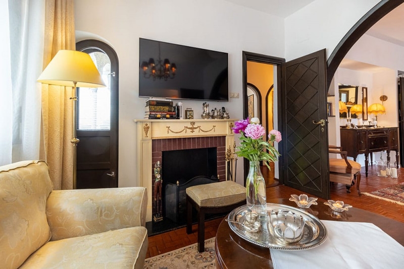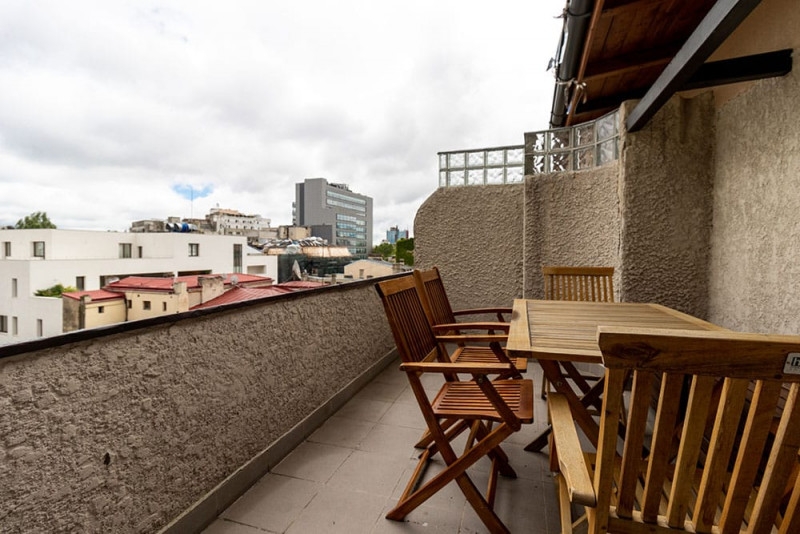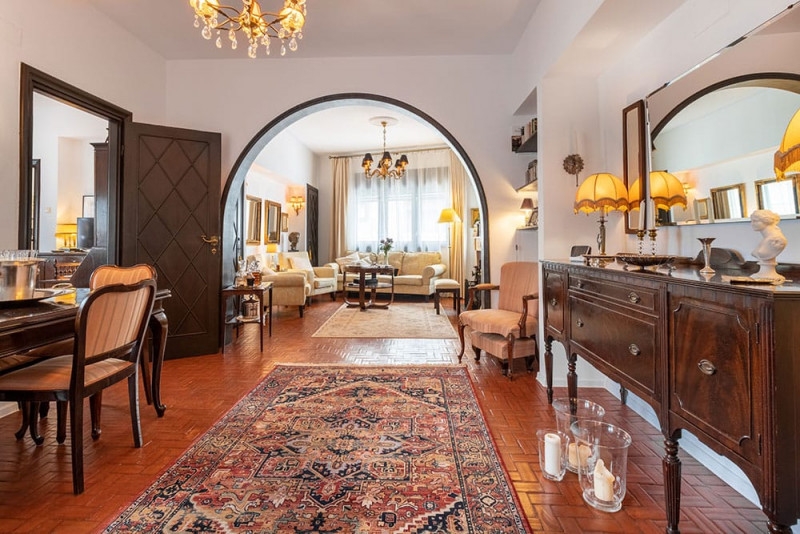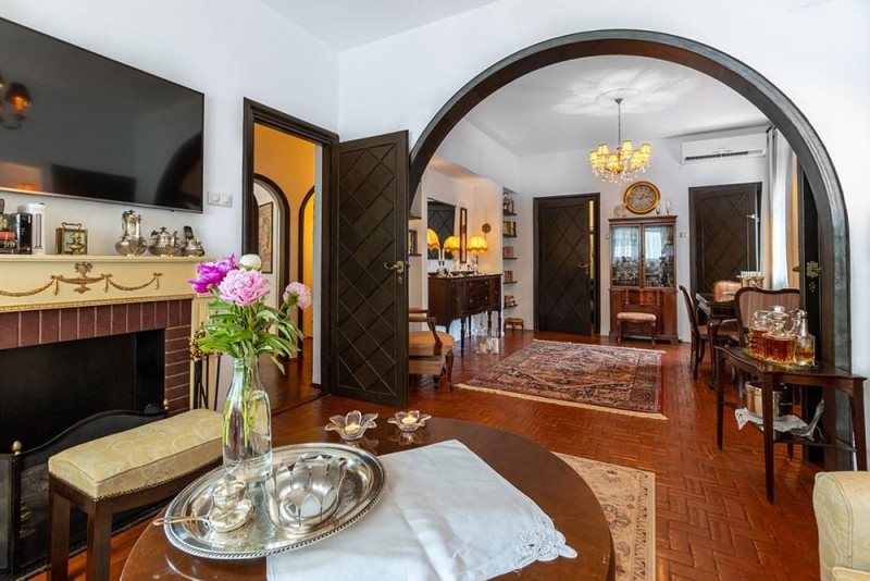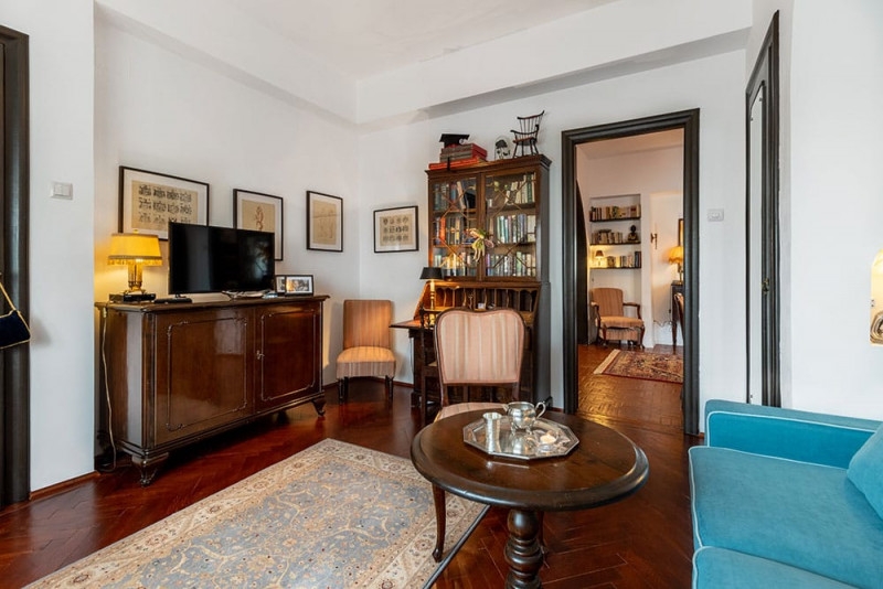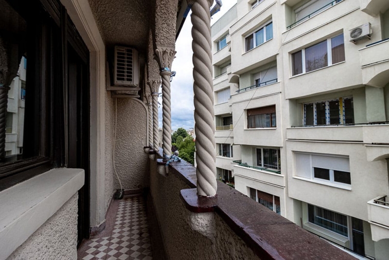 Apartamentul se afla la etajul 5 intr-un bloc postbelic ( 1946) si este rezultatul contopirii a doua proprietati - un apartament de 3 camere si un studio dublu ( din punct de vedere juridic sunt doua unitati locative). Este organizat astfel: un dormitor principal cu zona proprie de relaxare, baie si spatii de depozitare, 2 balcoane, 1 terasa privata si o chicineta. Dormitorul principal este legat de apartamentul de 3 camere si doua bai (unul dintre dormitoare are baie proprie, cu cada), printr-o usa camuflata intr-un dulap, putand astfel sa fie folosit si separat, ca studio, dar si impreuna cu capartamentul de 3 camere, usile principale de intrare in cele doua apartamente fiind pastrate, in holul blocului. Apartamentul de 3 camere este compus din dining, living, o baie pentru musafiri, cu dus, un dormitor matrimonial cu baie proprie, cu cada, o bucatarie complet echipata (inclusiv masina de spalat vase), o spalatorie (cu masina de spalat si uscator), un balcon, o terasa privata, dulapuri si spatii de depozitare. Proprietatea beneficiaza de sistem de incalzire pe gaze, cu centrala termica, controlat prin Wifi, sistem de aer conditionat si 3 boxe in subsol. Toate ferestrele au tamplaria si obloanele originale din lemn, reconditionate perfect.