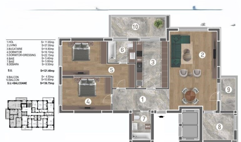 Compartimentare: Living generos (37 mp), 2 dormitoare (matrimonial cu dressing si baie proprie), bucatarie separata, 2 bai, birou (8,5 mp), 2 balcoane mari.