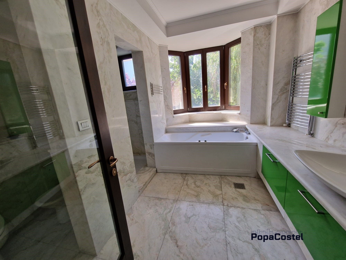 Suprafata desfasurata a vilei este de 500 mp, iar suprafata utila este de 410 mp. Constructia este dispusa pe parter, etaj si mansarda. La parter avem un living generos, o bucatarie, o camera care poate fi amenajata in birou, o baie si camera tehnica, plus multiple spatii de depozitare si garajul. La etaj avem trei dormitoare, doua bai, doua balcoane, plus dormitorul matrimonial cu dressing si baie proprie. La mansarda gasim un living, un dormitor si o baie, plus o chicineta. Vila dispune de finisaje de calitate, precum usi interioare de lemn, parchet lemn masiv, marmura, ferestre lemn cu geamuri termopan. De asemenea, dispune de doua locuri de parcare acoperite, in garaj, plus alte doua locuri exterioare, in curte. Proprietatea se afla intr-o zona linistita, in apropiere aflandu-se zona comerciala Baneasa, lacul Baneasa, Petrom City, precum si alte puncte de interes. Suntem agentie imobiliara si percepem comision. Mai multe oferte, detalii si informatii gasiti pe site-ul nostru: PopaCostel.ro