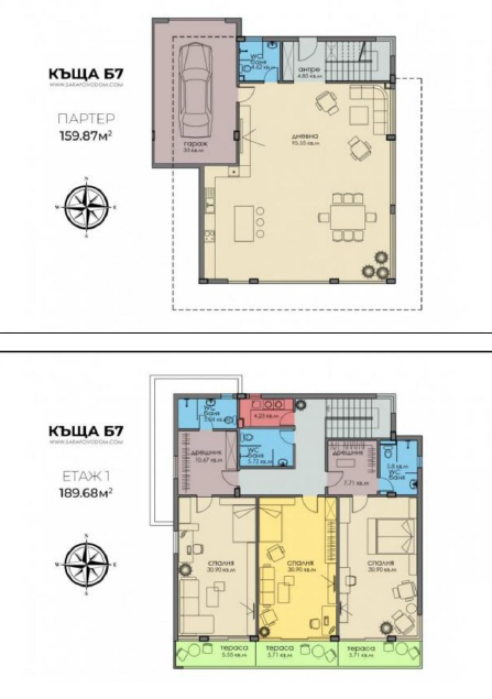 o Floor 2 (189.68 sq m) – three bedrooms with terraces , three bathrooms , utility room , two wardrobes