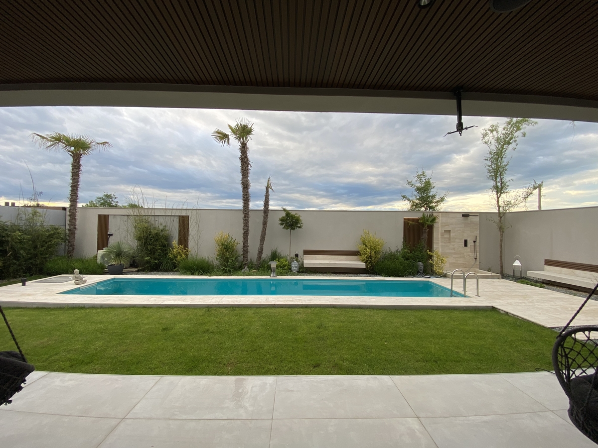 Gard beton armat de 3 m inaltime izolat si placat cu travertin + iluminat integrat