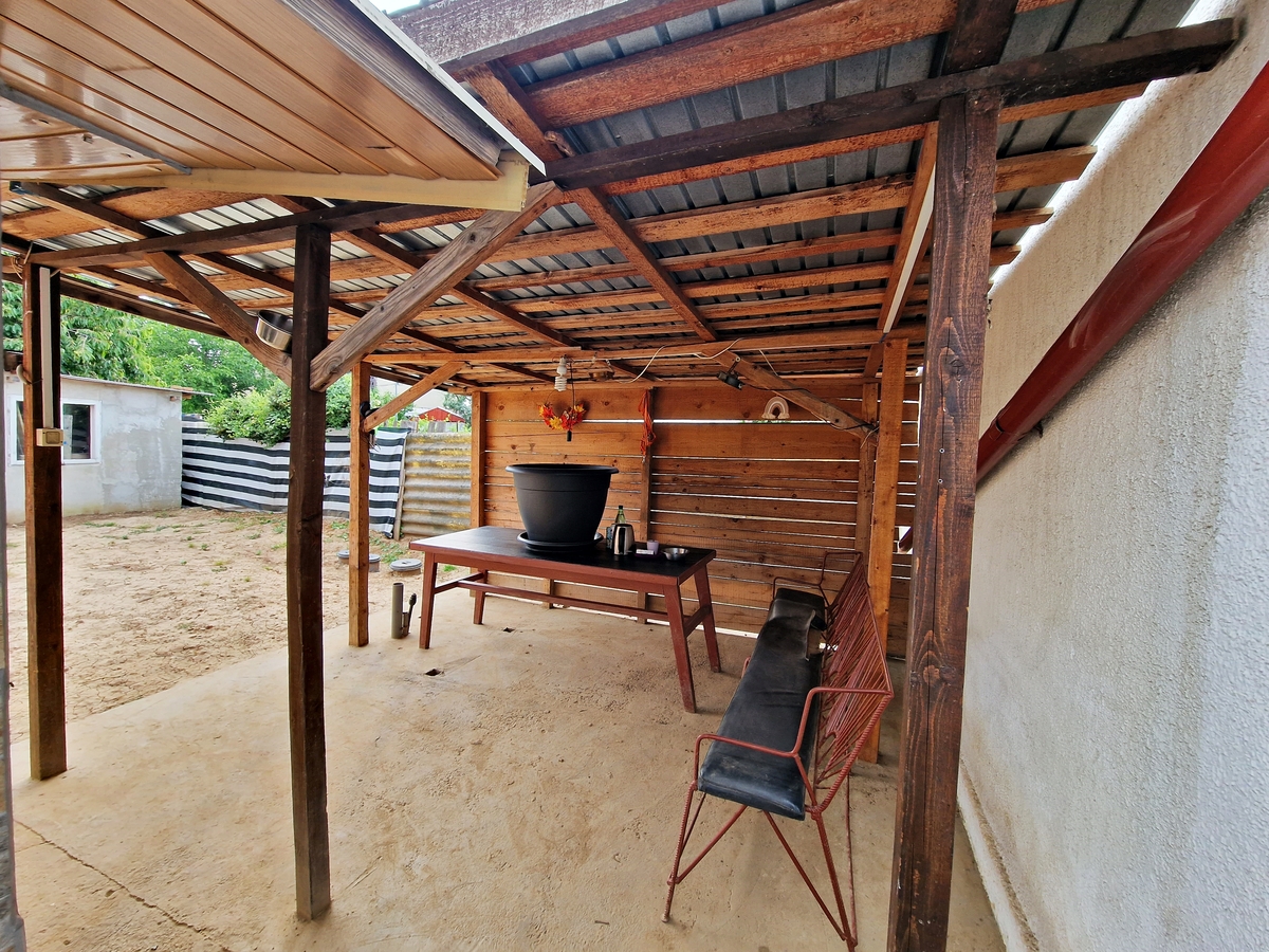 Bucataria a fost organizata intr-o constructie anexa, prevazuta cu apa curenta si soba de teracota. Intre cele 2 corpuri de cladiri este amenajata o terasa acoperita, un minunat loc pentru petrecerea timpului in zilele calduroase.