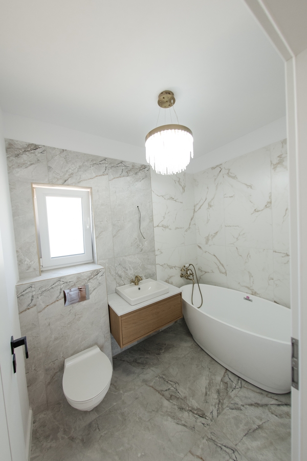 Interioare: Centrala termica, incalzire in pardoseala, instalatie electrica completa, usi interioare, gresie si faianta premium, parchet elegant, obiecte sanitare de calitate, scari cu balustrada, iluminat ambiental si tavane finisate impecabil.