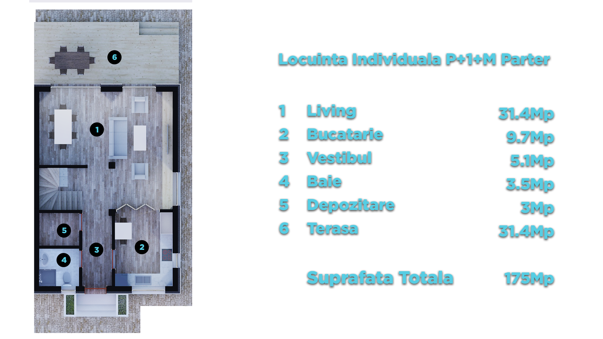 Parter: Bucatarie open, living generos si luminos cu iesire in terasa aflata in curtea din spatele casei, grup sanitar si spatiu de depozitare.