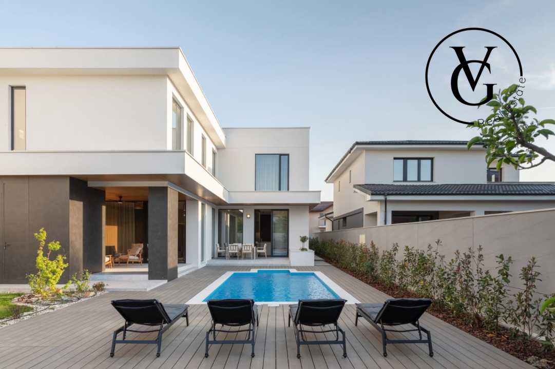 VG Real Estate va propune spre achizitionare o vila individuala amplasata in intr-o zona de case, ce dispune de curte proprie, piscina incalzita, spalatorie, 1 garaj, 2 terase acoperite si 3 locuri de parcare in curte.