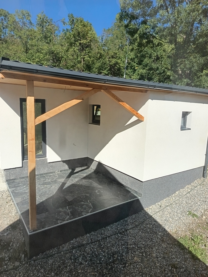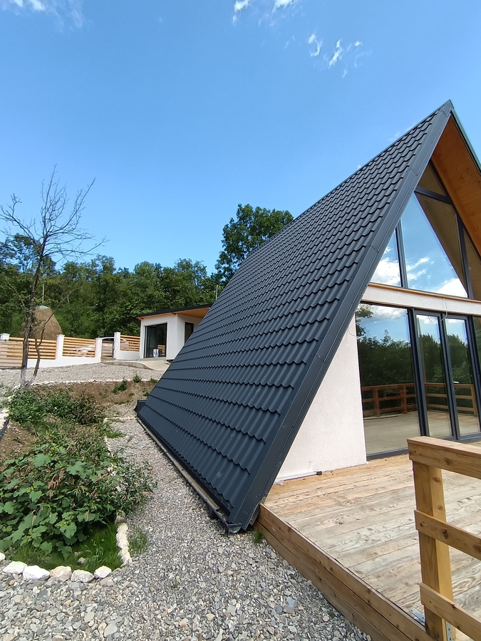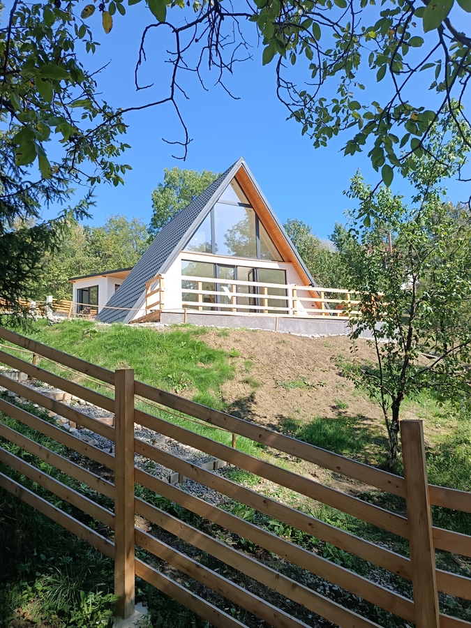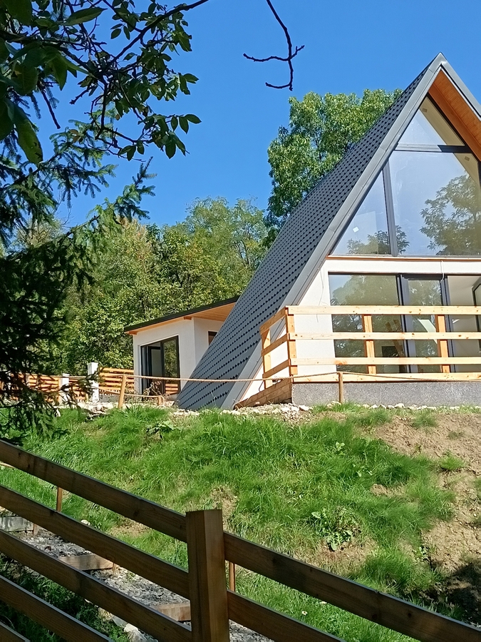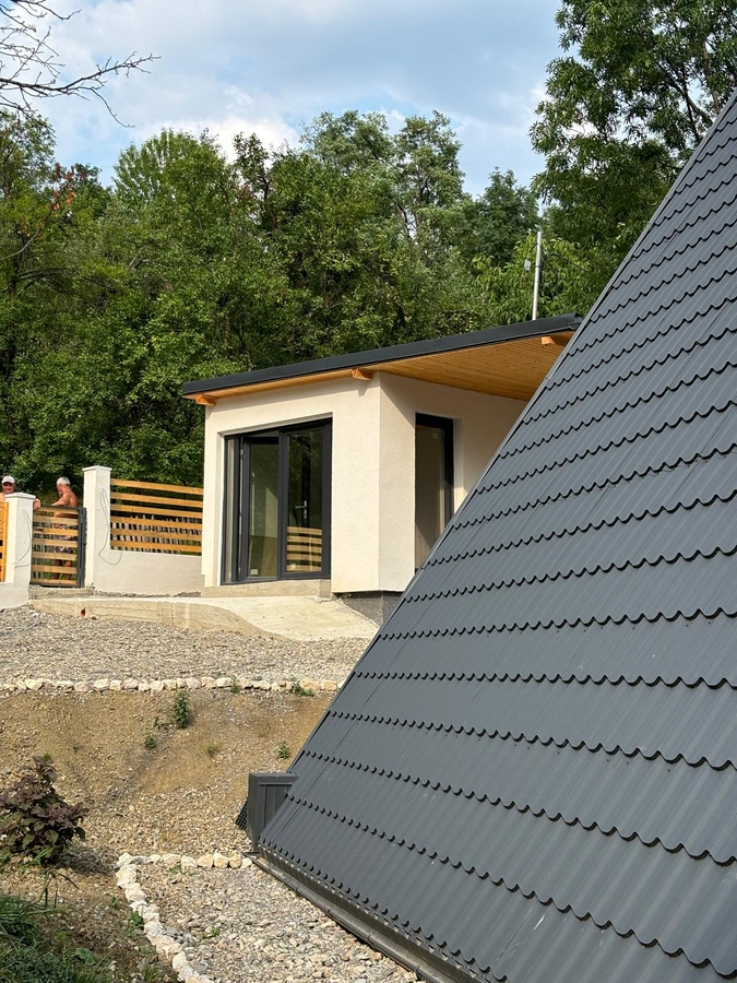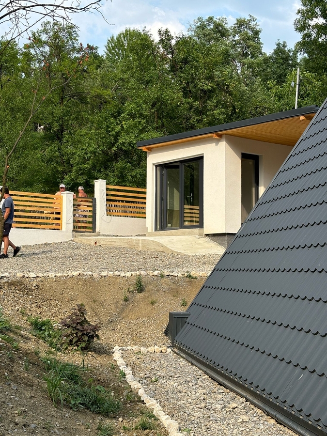 Constructie: fundatii de beton (nu pe piloni), lemn tratat antiincendiu si antiinsecte, OSB de 1.8 cm catre acoperis dar si catre interior, vata minerala, folie de aluminiu, rigips, acoperis Bilka, geamuri tripan Salamander, velux, izolatie termica cu polistiren de 10 cm Eps 100.
