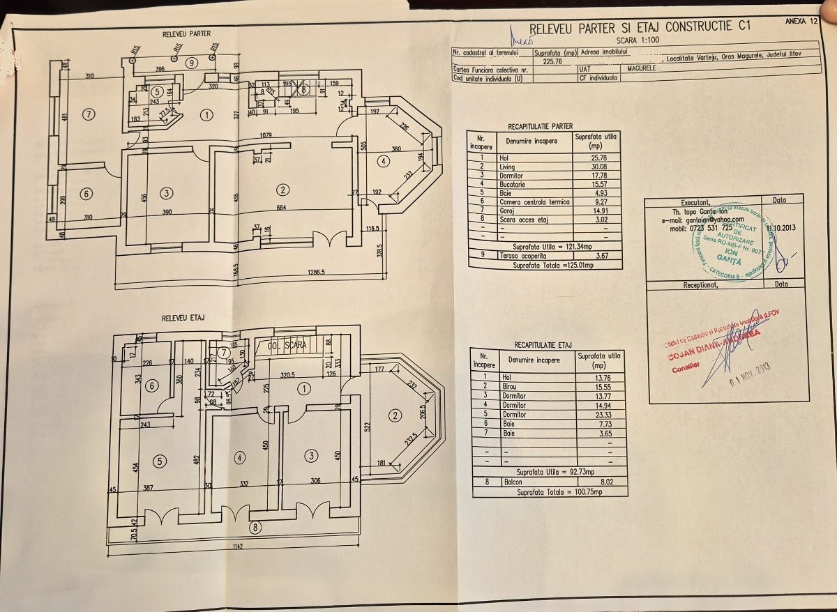 Imobilul este dispus P+1+Pod, are 6 camere si o suprafata utila totala de 226 mp, fiind amplasat pe un teren de 509 mp. Constructia este realizata in anul 2013, cu diriginte de santier si documentatie completa (studiu geotehnic, poze din timpul constructiei, raport de betoane).