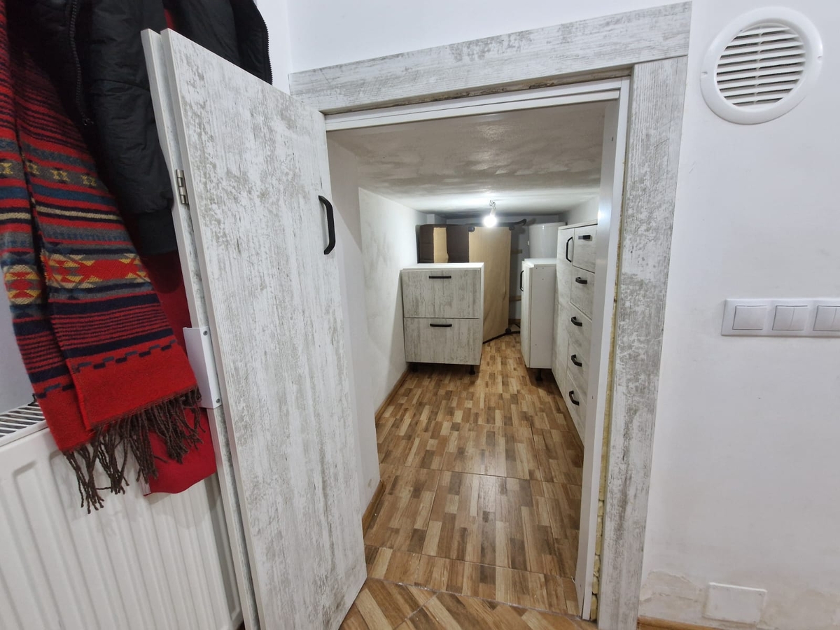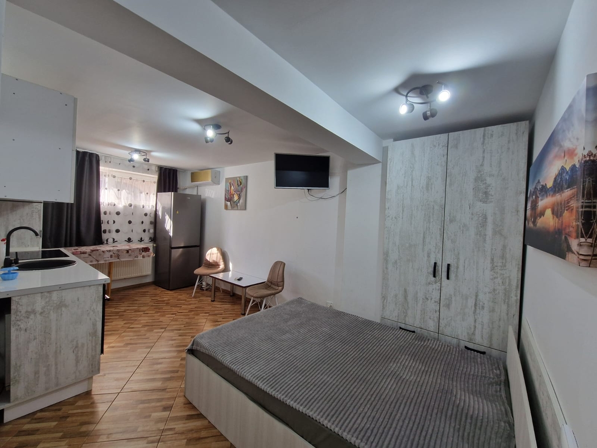 Hol de intrare generos, baie cu dus, camera de depozitare si camera principala cu bucatarie open-space.
