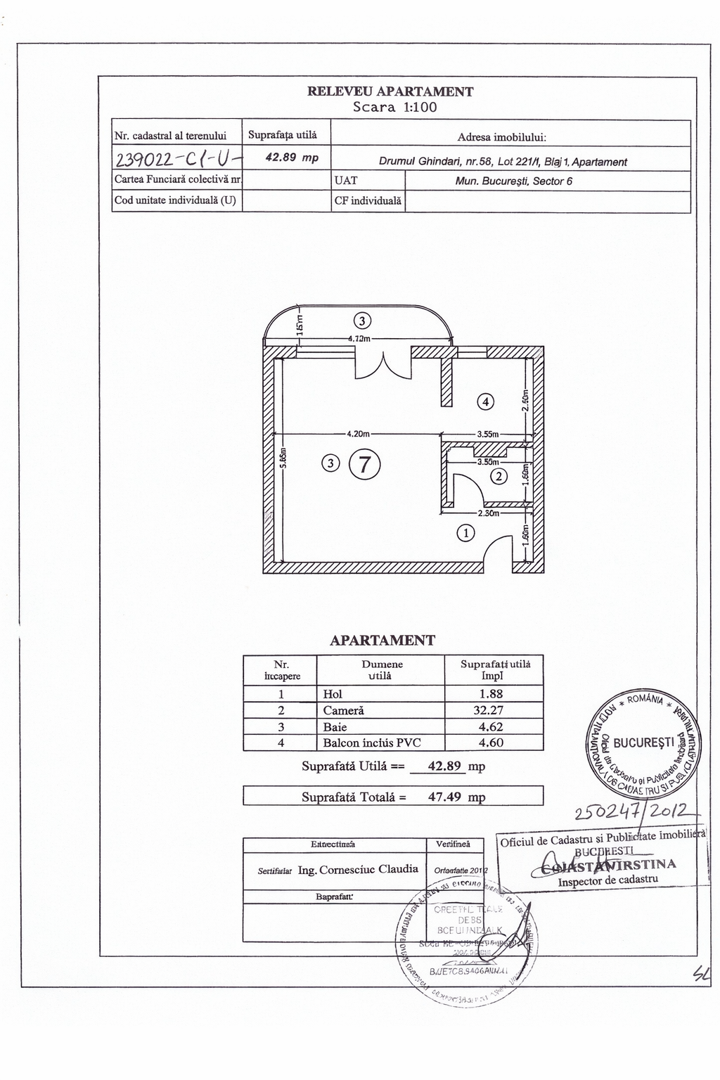 Garsoniera spatioasa, cu suprafata totala de 47 mp (42 mp utili + balcon 5 mp), situata la etajul 1 din 4 (imobil P+3), construit in perioada 2011–2012, pe Drumul Ghindari – zona Prelungirea Ghencea.