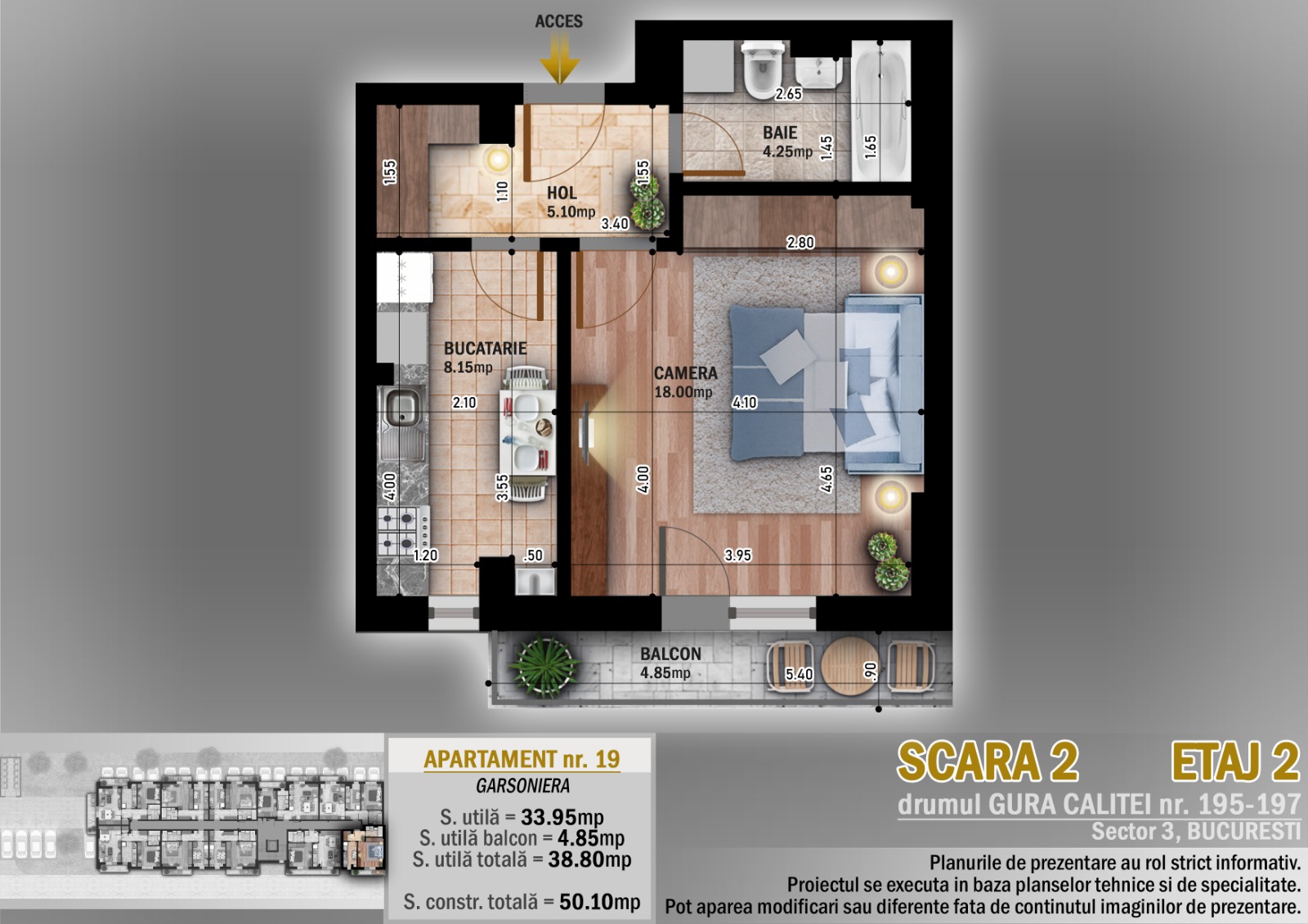 Garsoniera dispune de incalzire prin pardoseala si finisaje premium la alegere, ceea ce va ofera posibilitatea de a-l amenaja dupa bunul plac.