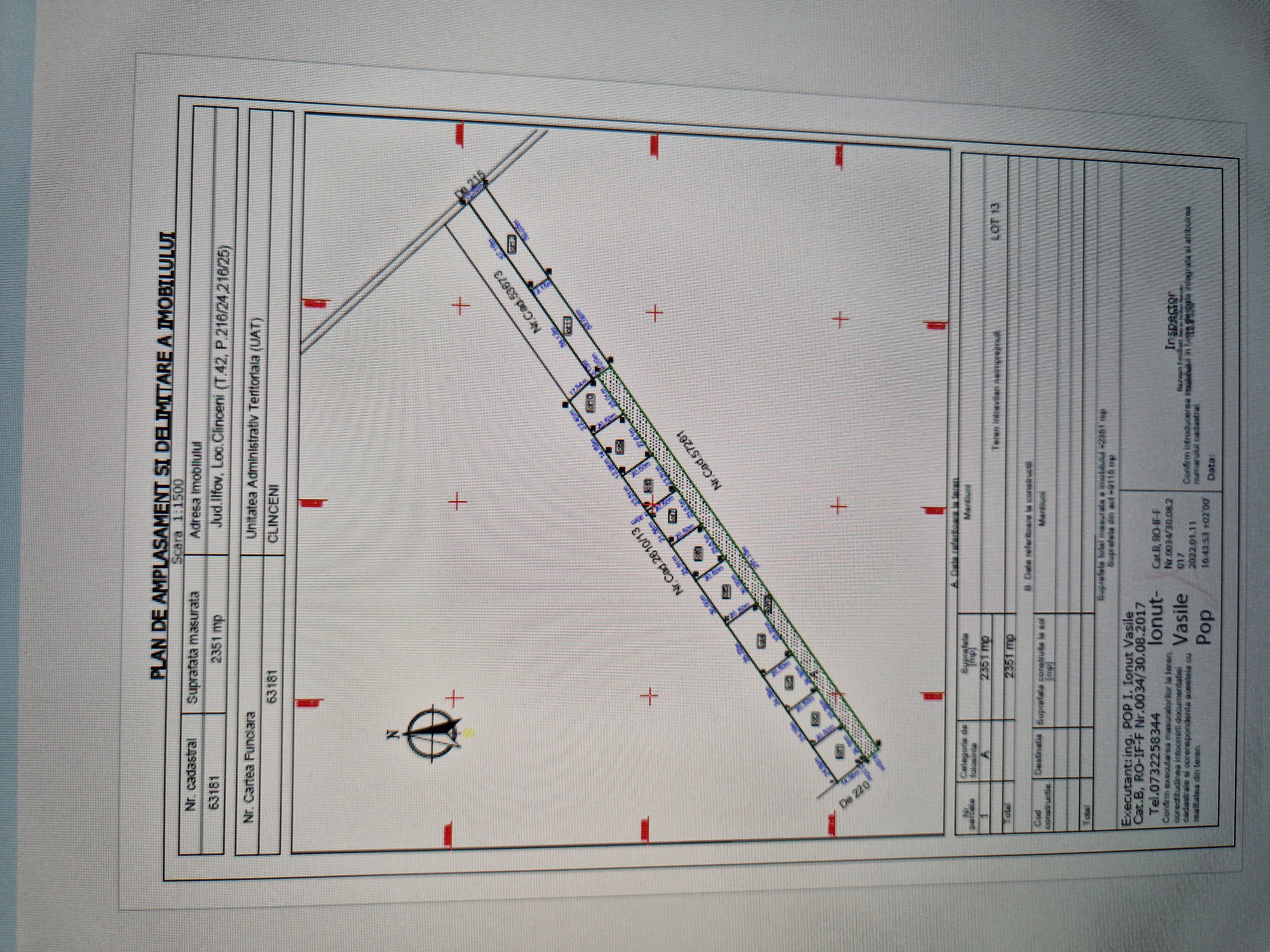 Vand un lot de teren intravilan in Clinceni, tarlaua 42, nr. cadastral 63173 situat intre autostrada A0 si stadion. Aproape de statia de autobuz de pe soseaua Clinceni-Ordoreanu. Suprafata este de 615 mp la care se adauga cota parte la drumul de servitute cu latimea de 9 m. Terenul are laturile de 20,5 m adancime respectiv 30 m deschidere la drumul de servitute. Regimul de inaltime conform certificatului de urbanism este P+2m, POT-30%, CUT-1, iar zona este destinata exclusiv constructiei de locuinte. In zona sunt case deja construite, utilitatile sunt foarte aproape, inclusiv apa si canalizare la care se lucreaza acum.