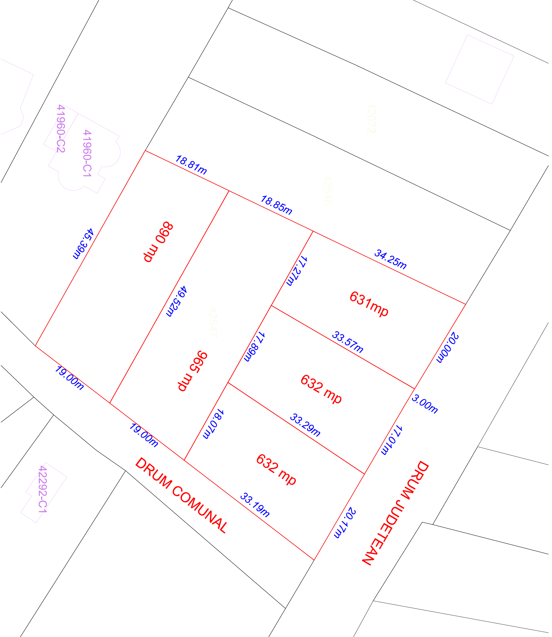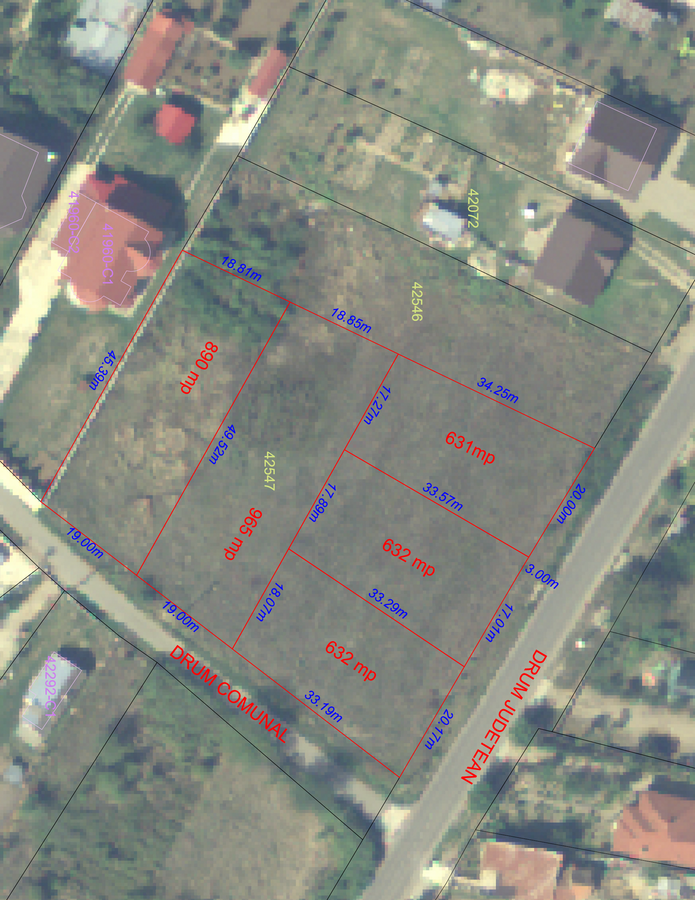 Terenurile sunt intabulate individual si au suprafete intre 620 si 1000 mp, fiecare avand deschidere de 20 metri la drum asfaltat.