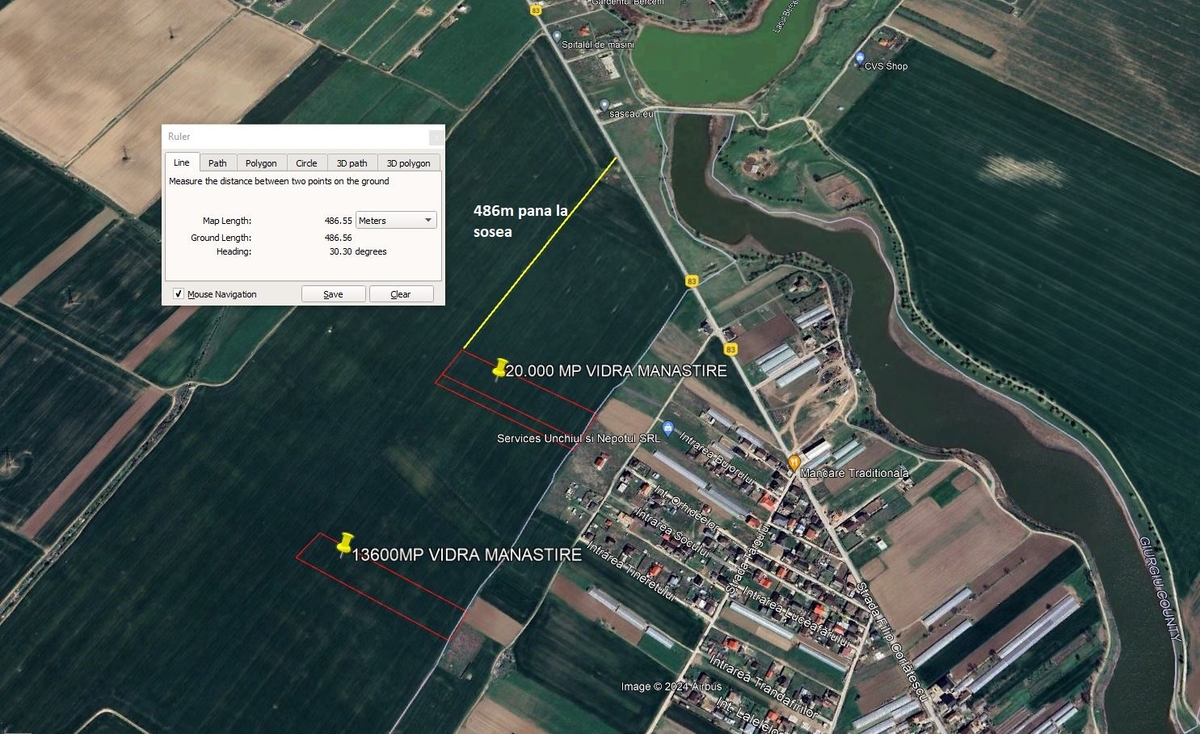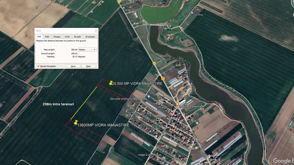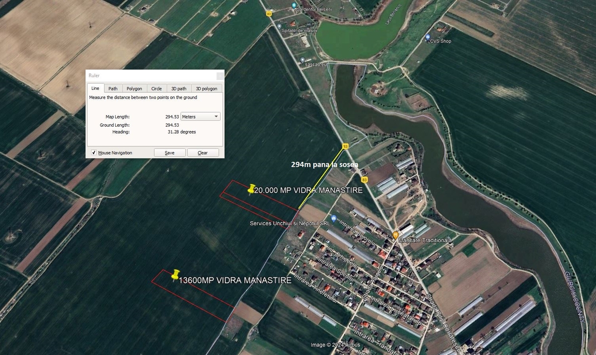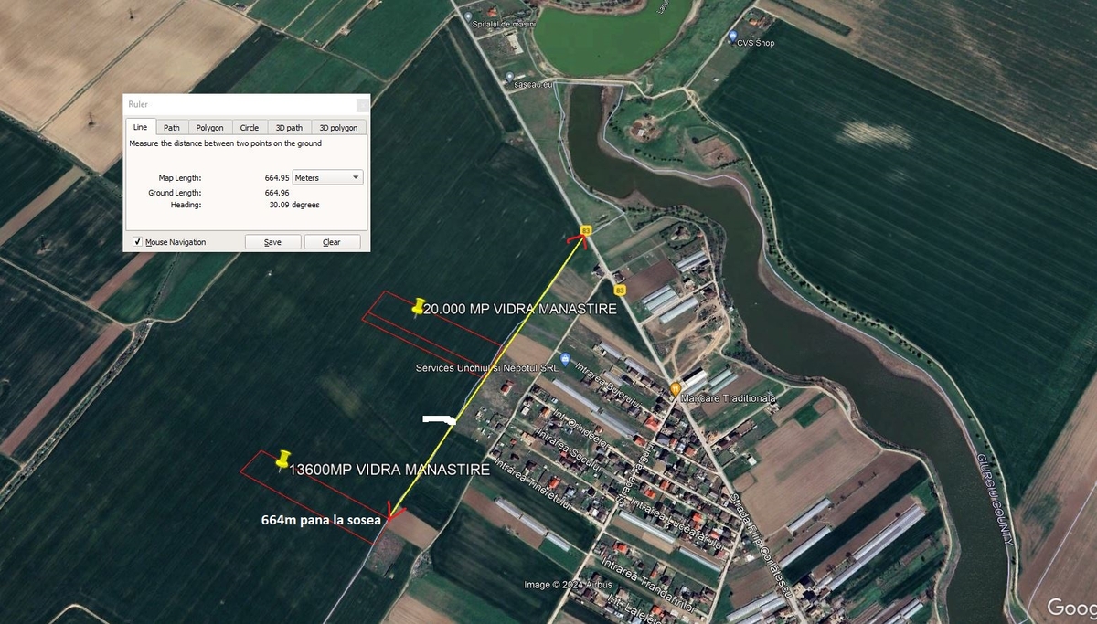 Lot 2: 13.600 mp, deschidere 47 m la drum (distante la sosea: 664-876 m).