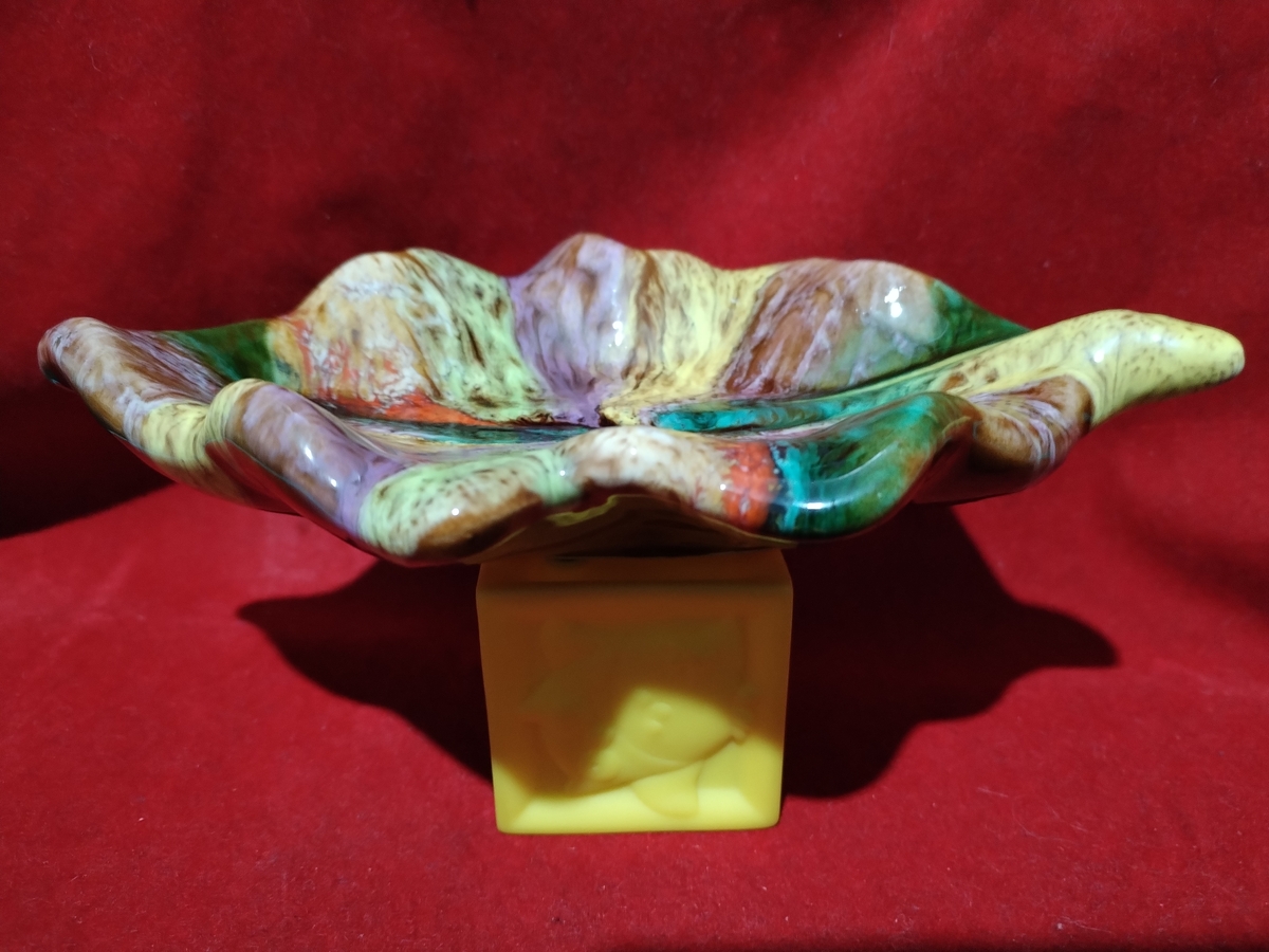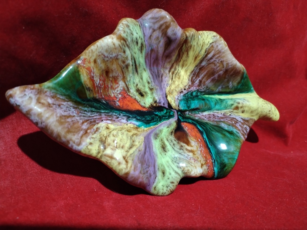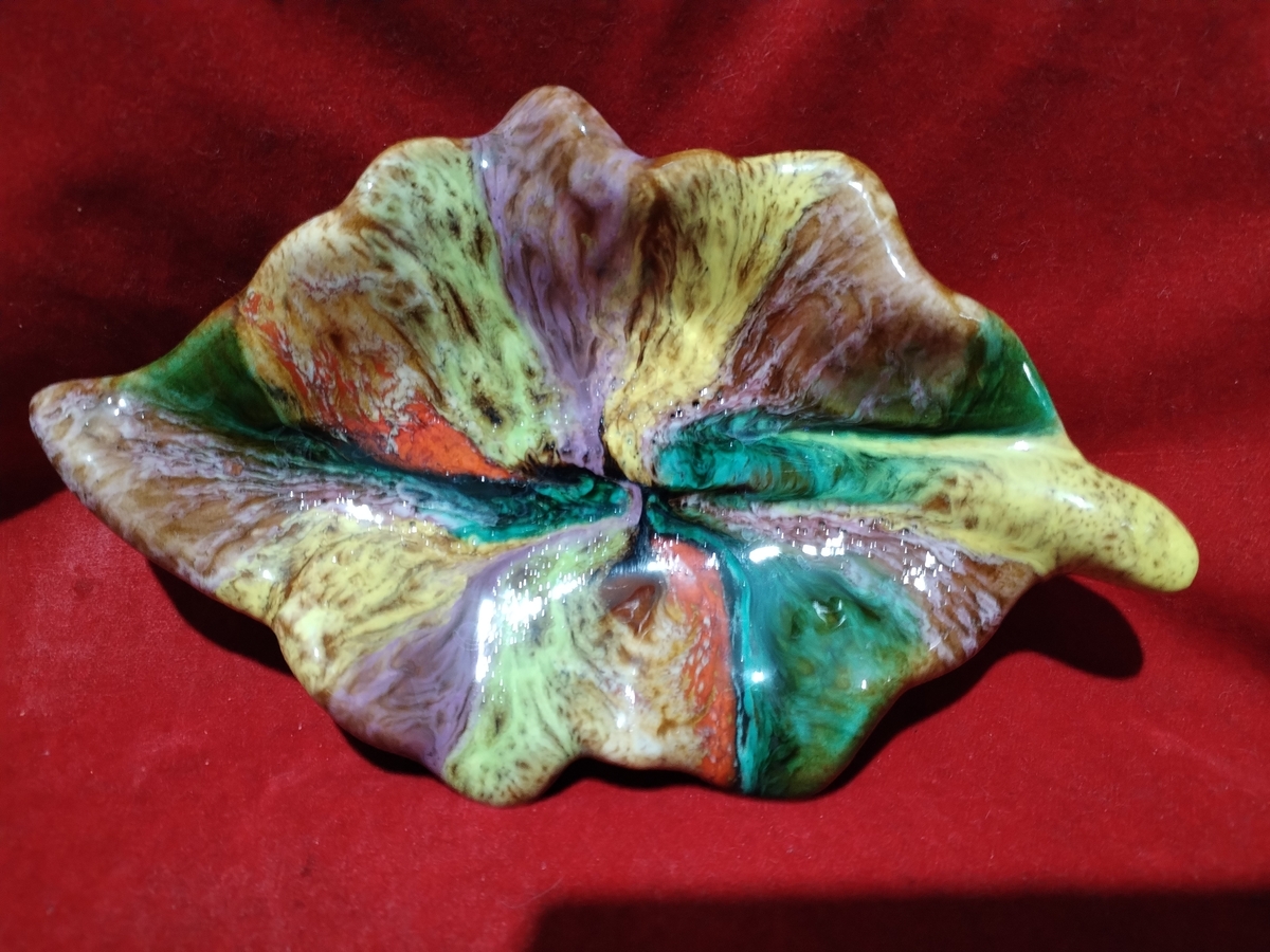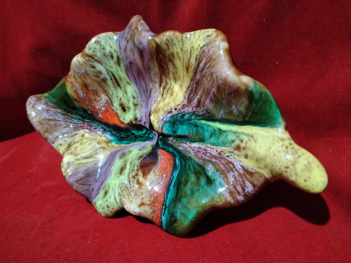 Decor incantator, realizata sub forma de frunza din ceramica emailata, plina de culoare.
