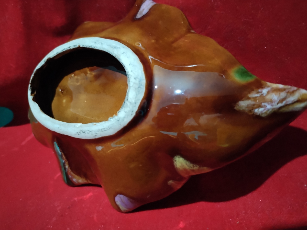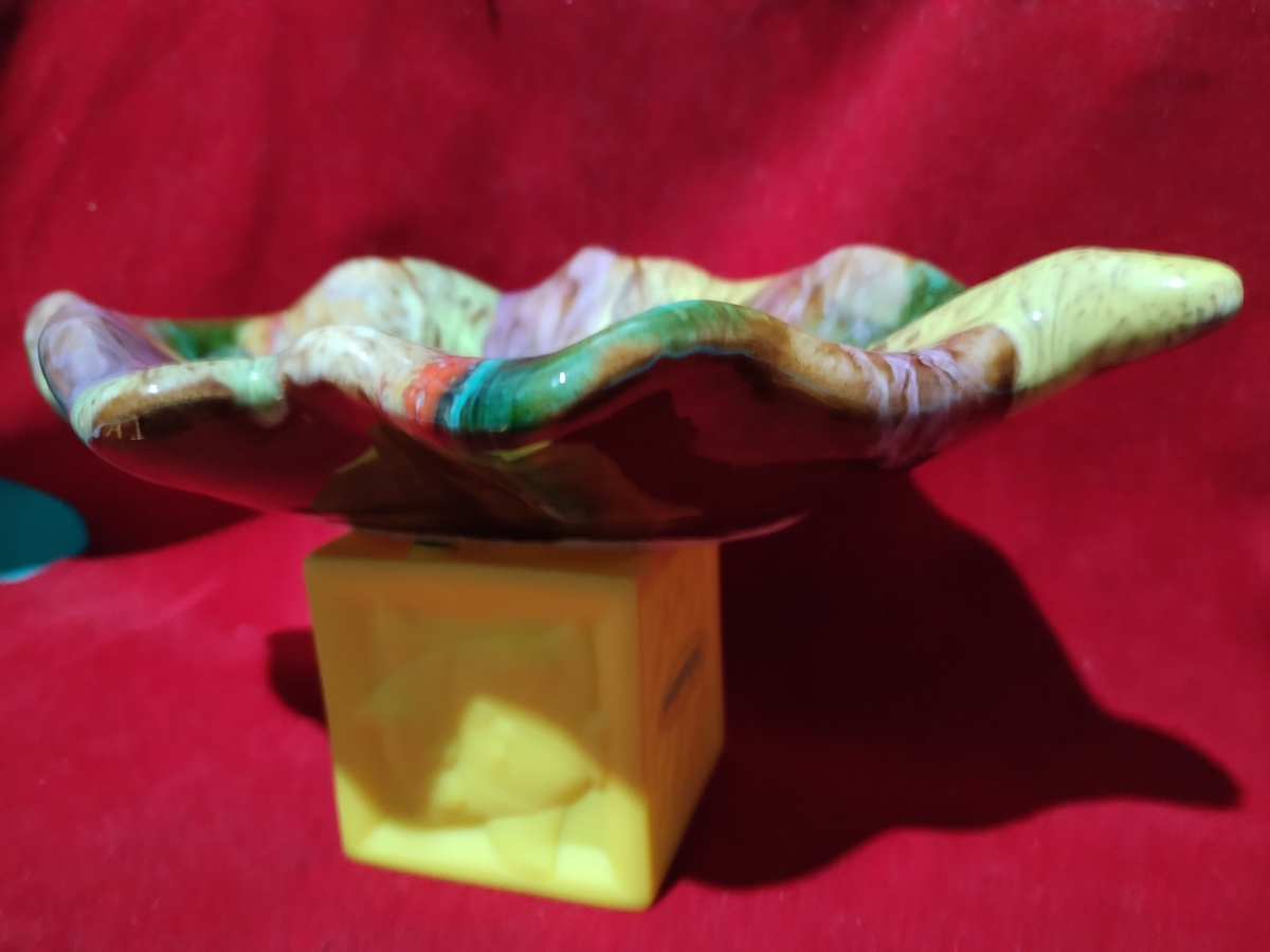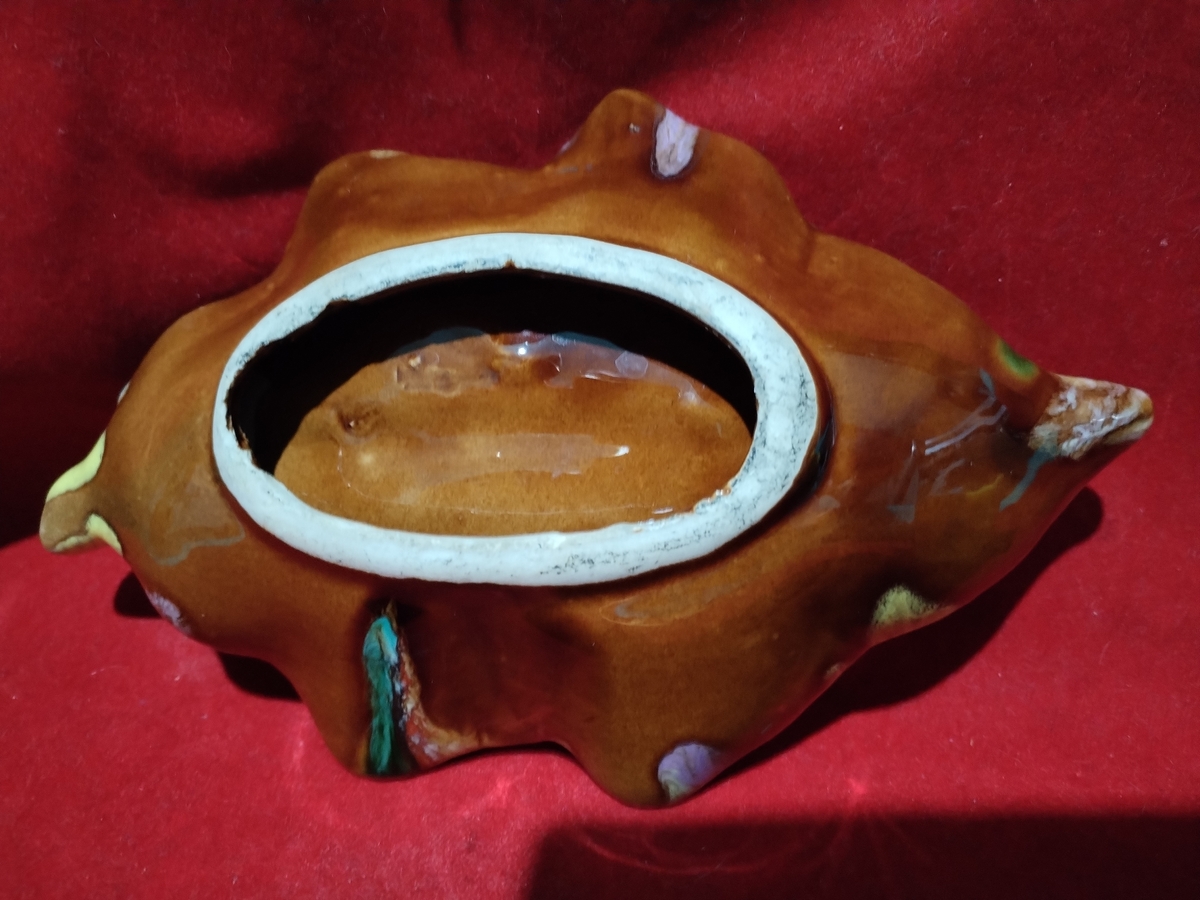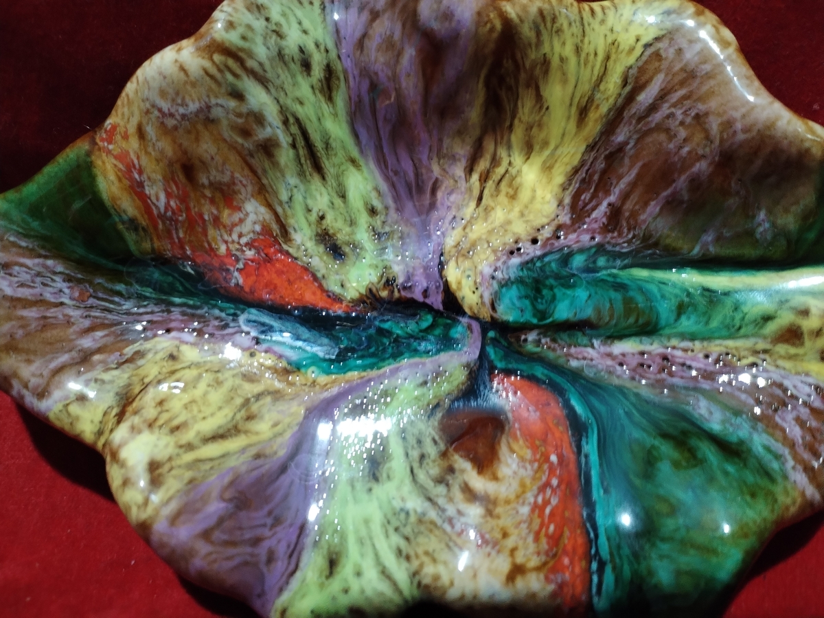 Decor incantator, realizata sub forma de frunza din ceramica emailata, plina de culoare.