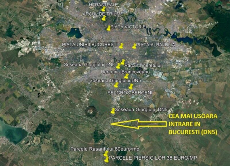 Padurea este la 400ml, in apropiere se construiesc atat case individuale cat si complexuri de case-vile, este o zona care cunoaste o dezvoltare sanatoasa, apropiata de Centura 2 - A0, cu regim de autostrada, ce va inconjura Bucurestiul si care are un picior de pod chiar la 1,5 km de teren, facilitand accesul practic in orice punct al Bucurestiului sau din tara prin acces facil la toate arterele de intrare in oras sau autostrazile spre orice loc din tara (mare, munte, strainatate, etc) si datorita proximitatii fata de capitala. Prin DN5 se ajunge in 50 de minute in Bulgaria - Giurgiu Russe, este practic in drumul spre Grecia.