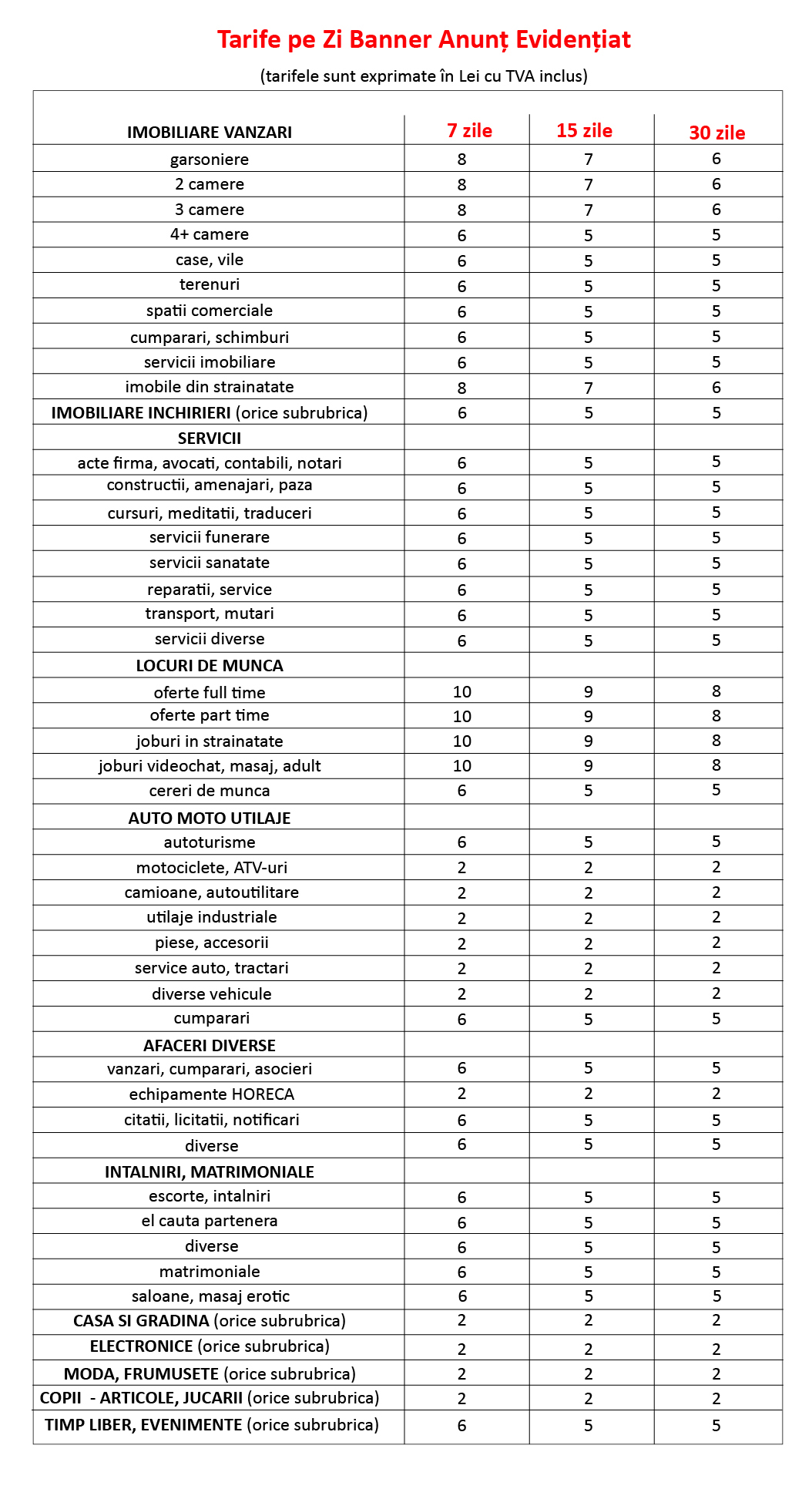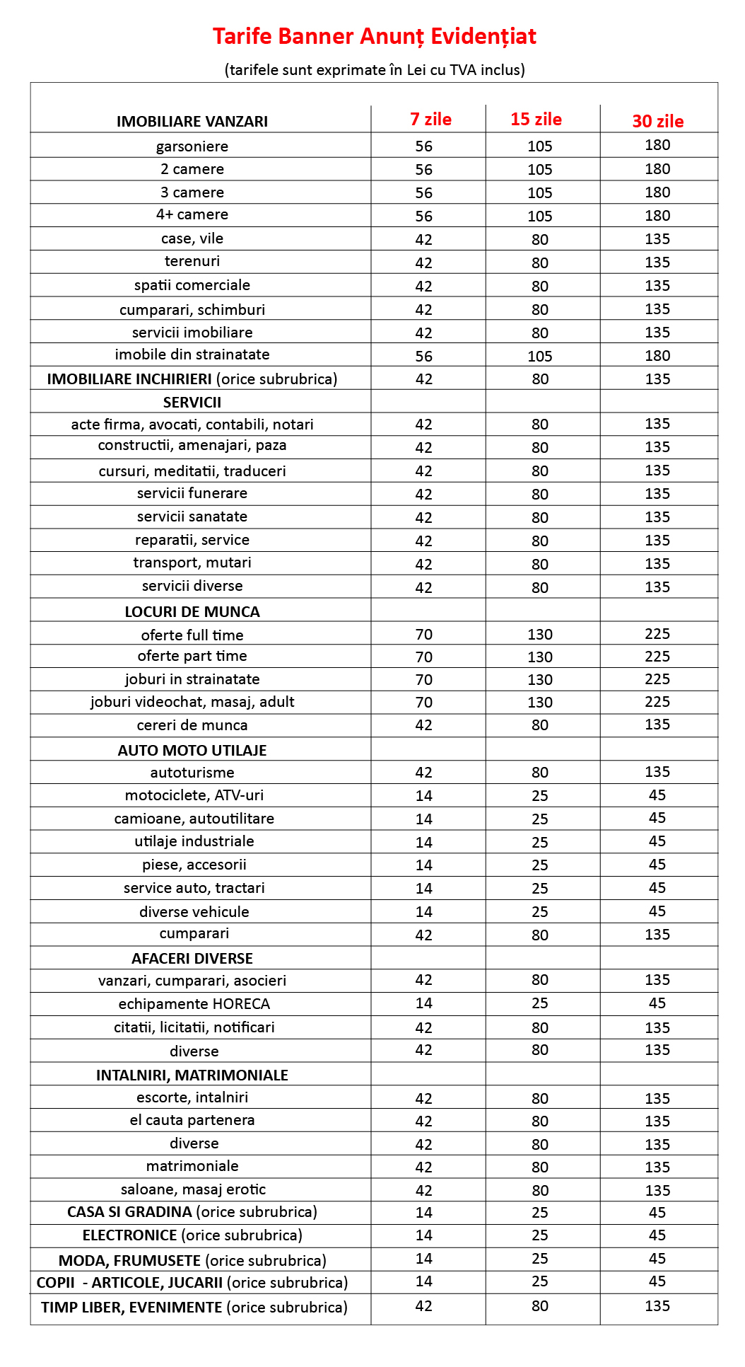 Accesarea, vizitarea site-ului in scopul inregistrarii unui cont de utilizator si publicarea anunturilor echivaleaza cu acceptarea in totalitate si neconditionata a Termenilor si Conditiilor, valabile la data accesarii.